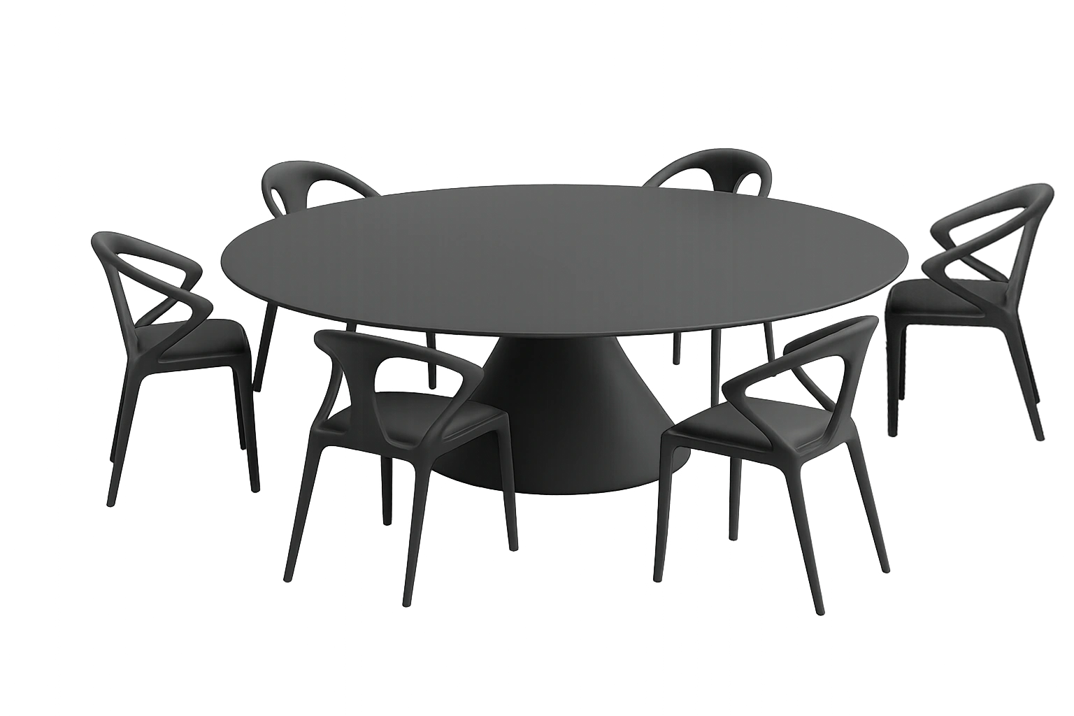 Features a round table with a conical base and six matching chairs with curved backs and sleek designs suggesting a contemporary aesthetic.