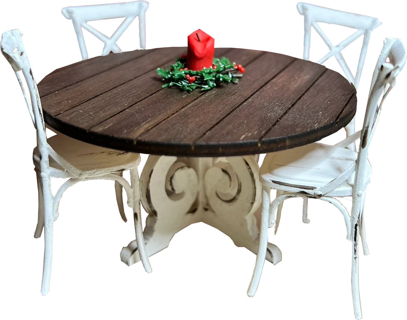 Dining set with two miniature bench seats or sofas and a miniature table with a central pedestal base. This furniture has been designed for dollhouses or other miniature displays